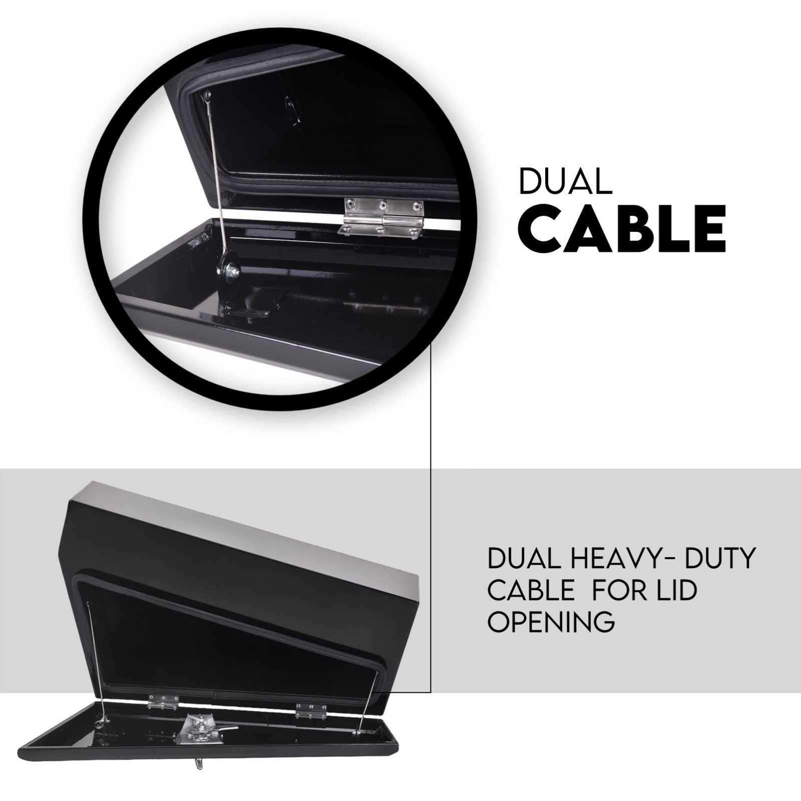 Similar to its flat plate under tray toolbox and plate aluminium flat counterpart, it is built with super-heavy duty steel. Secure this black powder coated toolbox on the underbody of your truck or UTE for maximum strength and secure extra storage space.