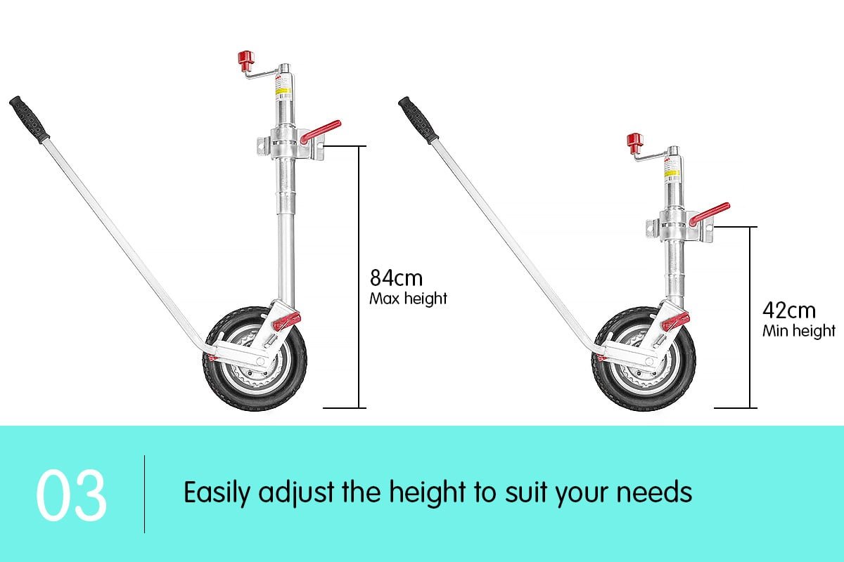 With a 350kg static capacity, 10-inch solid rubber tyre, emergency stop feature, and adjustable height, this jockey wheel is a must-have for all your towing and moving needs.