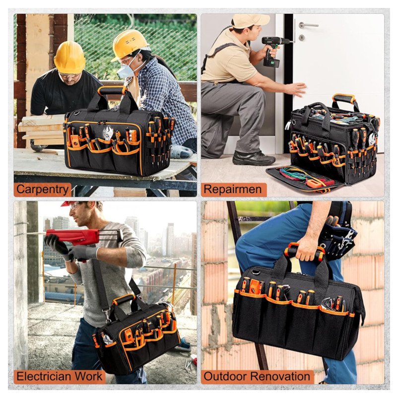 Organise, store, and transport your tools with ease in this Heavy-Duty 17-Inch Wide-Mouth Tool Bag. Constructed from durable, double-layered 1200D Oxford fabric, this bag is designed to withstand the toughest job site conditions. It boasts a massive 35L capacity and a total of 46 pockets for superior organization, including 18 interior pockets, a large main compartment, and 27 exterior side pockets. The rigid, waterproof plastic base with non-slip rubber mats keeps the bag upright, clean, and protects contents from water and dirt. Featuring a heavy-duty double zipper, a comfortable padded handle, and a detachable, adjustable shoulder strap, this tool bag is perfect for carpenters, repairmen, electricians, and DIY enthusiasts.