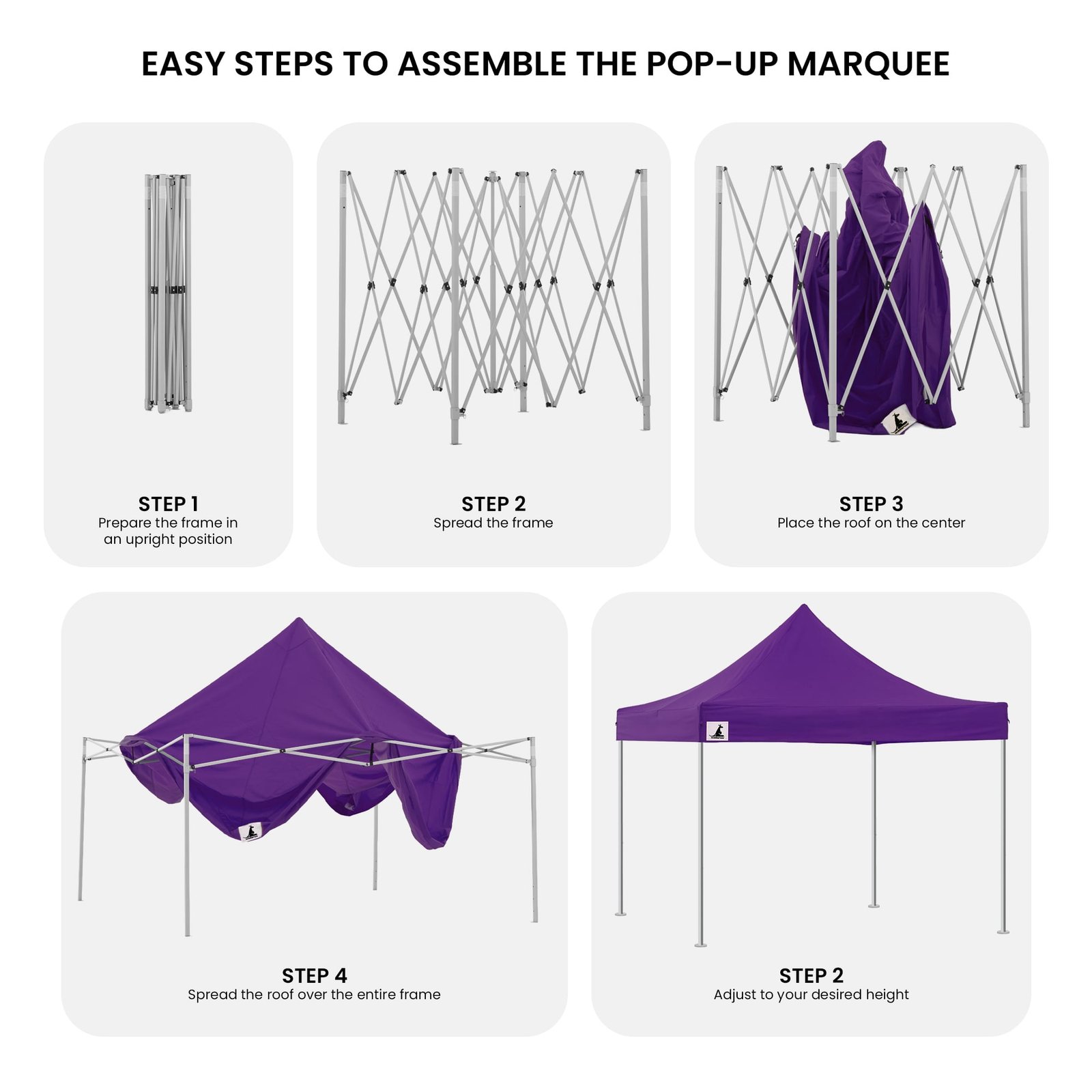 Our strong triangulated frame system means this marquee comprises only 2 main parts. The frame is one complete assembly which expands to 3x3m and the roof is fitted over the frame as it unfolds, giving you instant cover from rain or sun! You can then set the height of the legs and fit the walls if required. When you’re done you can just as easily fold the frame and roof away into the carry bag we provide, ready for transport or storage. The entire setup process will take 2 or 3 people just a few minutes!